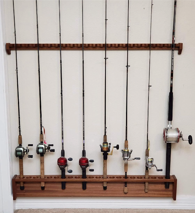 Rod Rack, Wall Mount Fishing Pole Holder, Solid Mahogany Wood, Large, Versatile, Compact